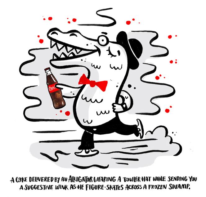 A Coke delivered by an alligator wearing a bowler hat while sending...